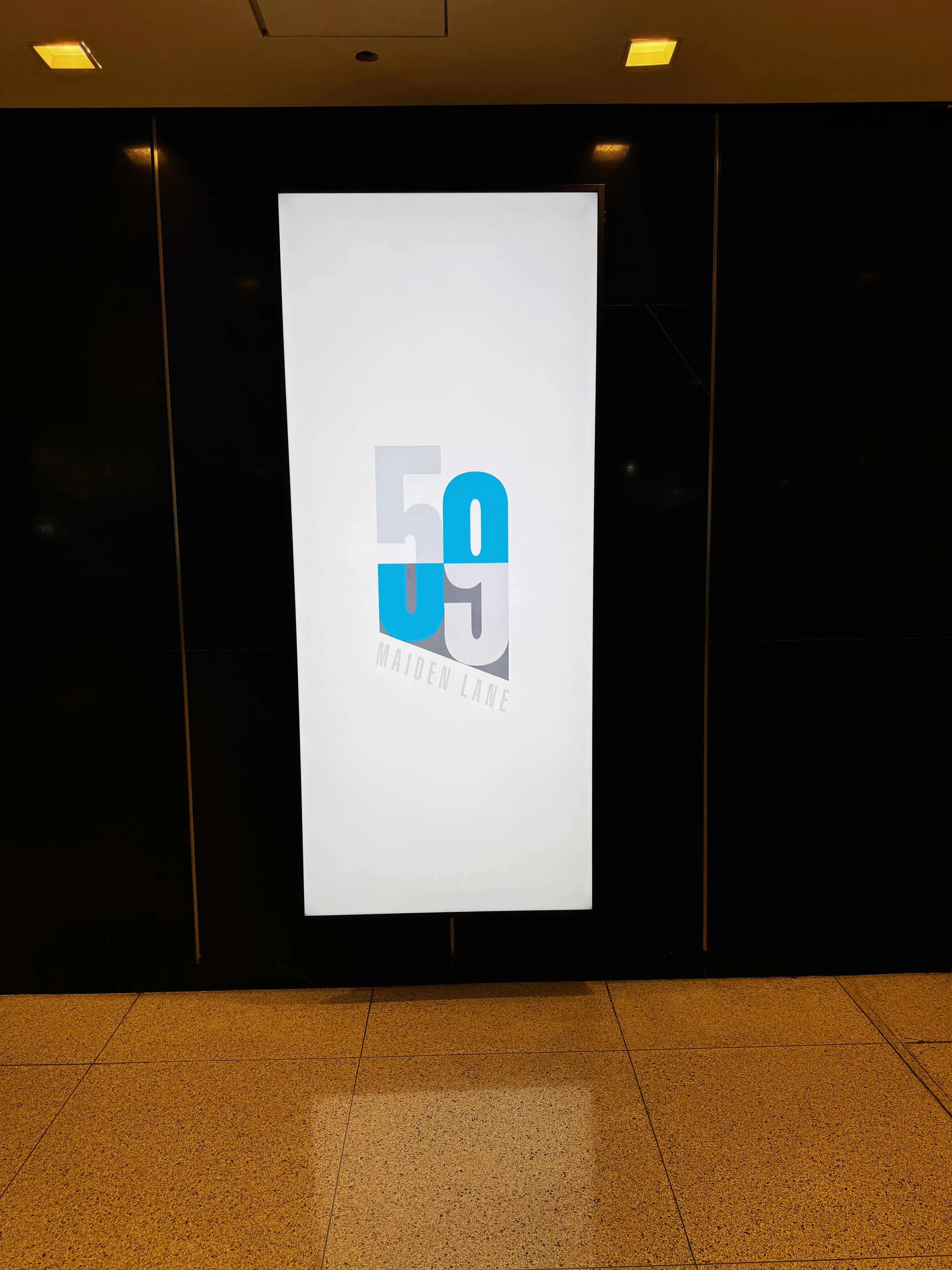 59 Maiden Lane installed a 92" Vivid X LCD Display in portrait mode in their lobby to provide tenants with information about building updates and construction. The vertical format maximizes visibility in the high-traffic lobby while maintaining the sophisticated aesthetic expected in a Lower Manhattan commercial property.