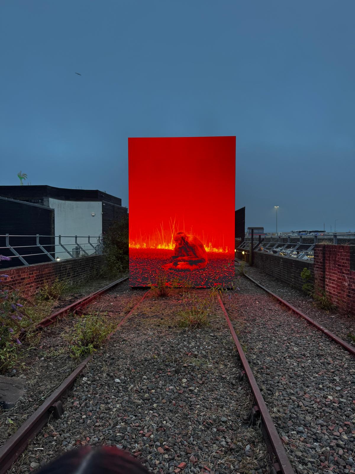 BSX provided an Xterra Outdoor LED Display to power Ghost Feed, a striking work where a monkey stares at its phone while a digital forest burns around it. The flames are virtual, but the destruction is real, drawn from Amazon and California wildfire data. The weatherproof Xterra brings this haunting piece to life in Folkestone's coastal environment, inviting viewers to confront their role as passive observers in a time of crisis.